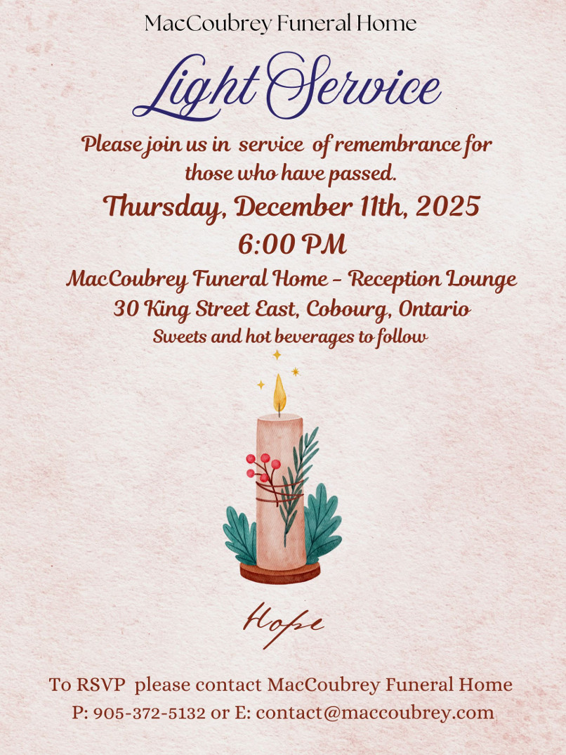 MacCoubrey Funeral Home Ltd. - Cobourg and Colborne locations are both Licenced by The Bereavement Authority of Ontario as Funeral Establishments Class #1, #099 and #122